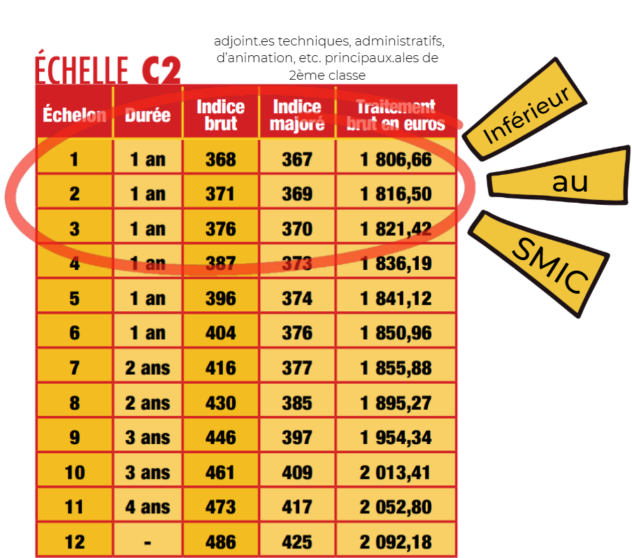 Au 1er janvier les 5 premiers échelons en C1 et les 3 premiers échelons en C2 seront en dessous du SMIC. Le 1er échelon de la catégorie B sera lui 13 euros seulement au-dessus du salaire minimum !